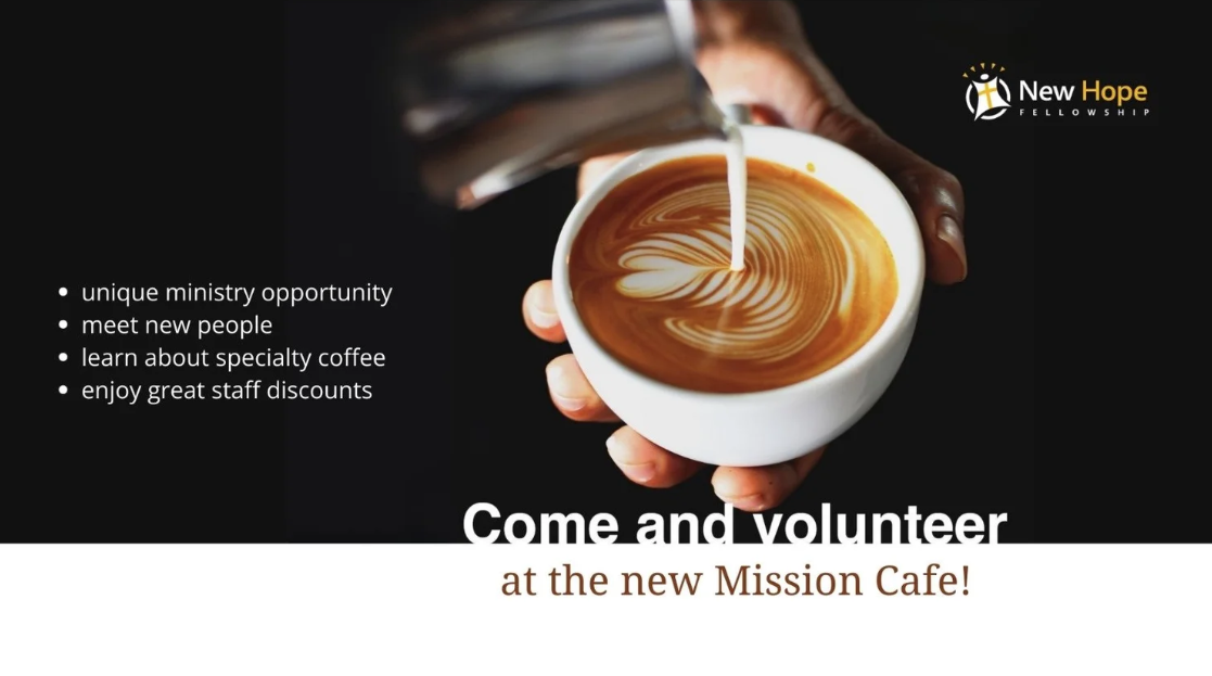 Construction of the new Mission Cafe will continue for several weeks. This is a unique ministry where you can meet new people, learn about specialty coffee, and enjoy great staff discounts.