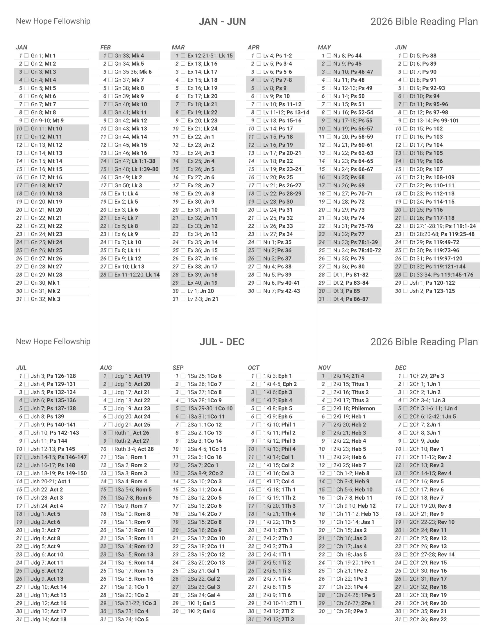 As a church family, we follow the Robert Murray M’Cheyne (RMM)’s two-year Bible reading plan. For 2026, we will be on year-1 which will take us through the first half of the Old Testament, plus all of the New Testament and Psalms. It is one of the best ways to read the Bible in a systematic and coherent way by which we get to see how the Bible fits together. It is also one of the most widely used Bible reading plans whereby we get to be part of a worldwide Bible reading community.