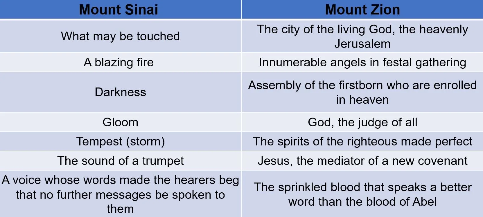 18 For you have not come to what may be touched, a blazing fire and darkness and gloom and a tempest 19 and the sound of a trumpet and a voice whose words made the hearers beg that no further messages be spoken to them. 20 For they could not endure the order that was given, “If even a beast touches the mountain, it shall be stoned.” 21 Indeed, so terrifying was the sight that Moses said, “I tremble with fear.” 22 But you have come to Mount Zion and to the city of the living God, the heavenly Jerusalem, and to innumerable angels in festal gathering, 23 and to the assembly of the firstborn who are enrolled in heaven, and to God, the judge of all, and to the spirits of the righteous made perfect, 24 and to Jesus, the mediator of a new covenant, and to the sprinkled blood that speaks a better word than the blood of Abel.