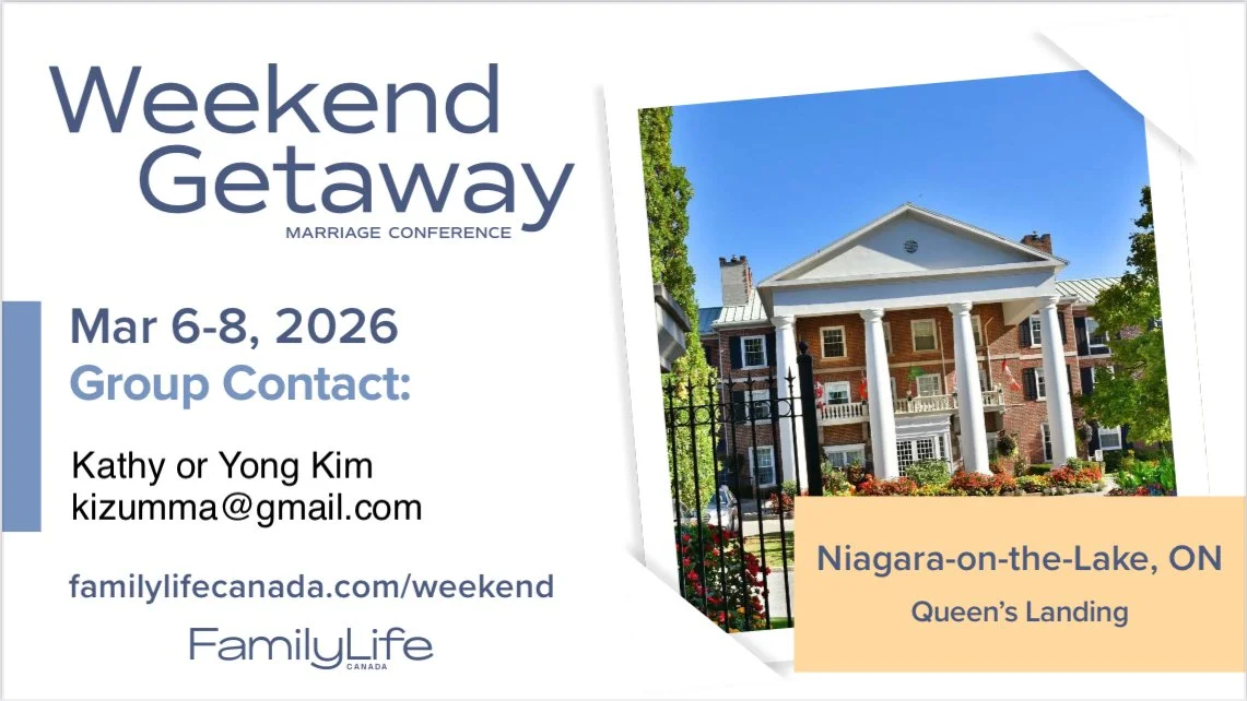 Family Life Marriage Conference open to married couples: March 6-8, 2026 @ Niagara-on-the-Lake. Group rate $225 registration only. Subsidy for registration excluding accommodation. Registration & Room Booking Deadline: February 6 for group rate $225; special room rates at $199/night going fast!!!