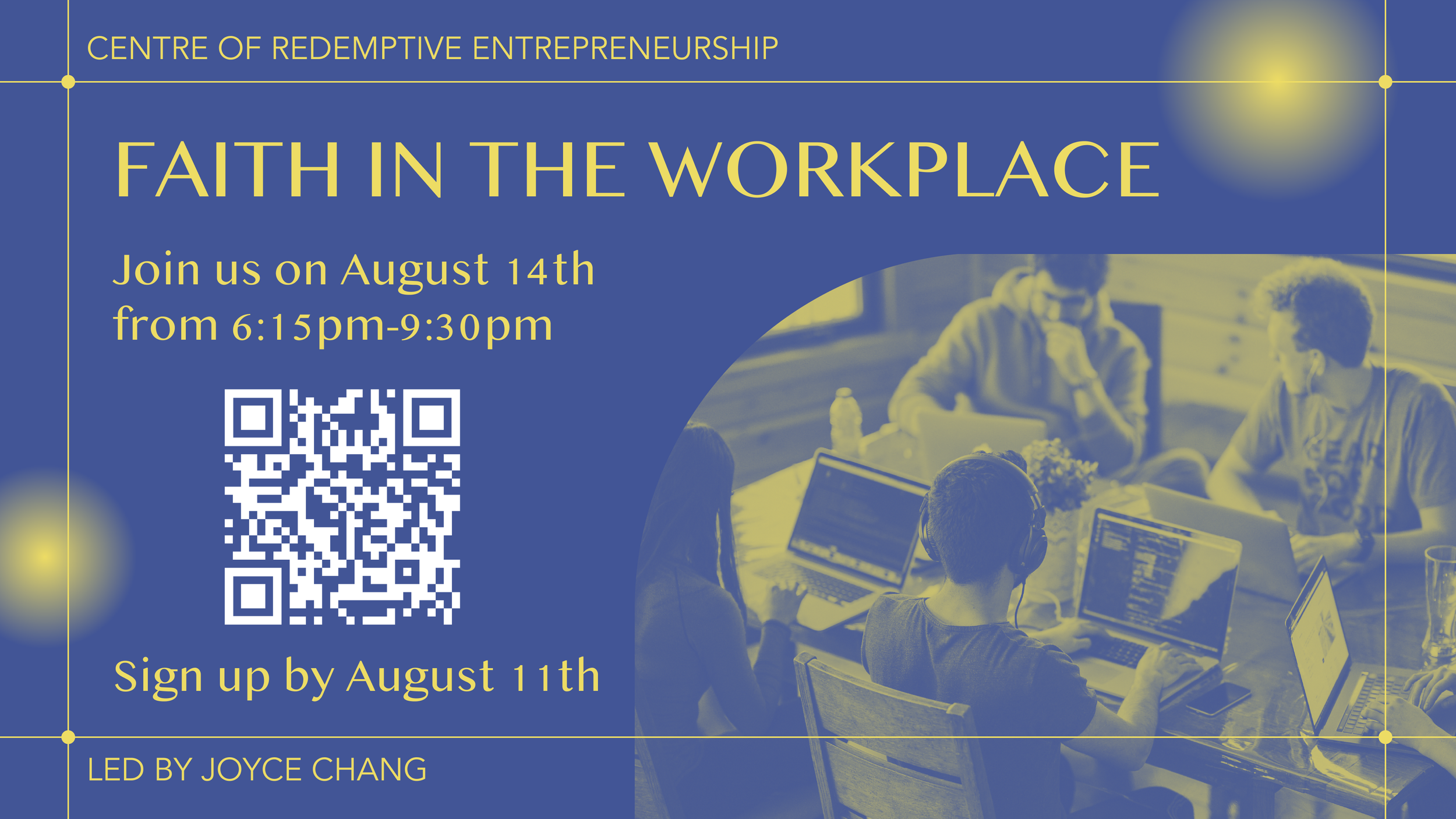Are you curious on how you can live out your Christian faith in your work? Join us on Wednesday, August 14th from 6:15pm-9:30pm for our “Faith in the Workplace” workshop where we dive into why work matters in God's kingdom, and how we can play a part in restoring the world through it. Led by Joyce Chang from the Centre of Redemptive Entrepreneurship (https://www.tyndale.ca/cre), this workshop will provide valuable information as well as a space for discussion and application in smaller groups. Please RSVP here by August 11th to reserve your spot!