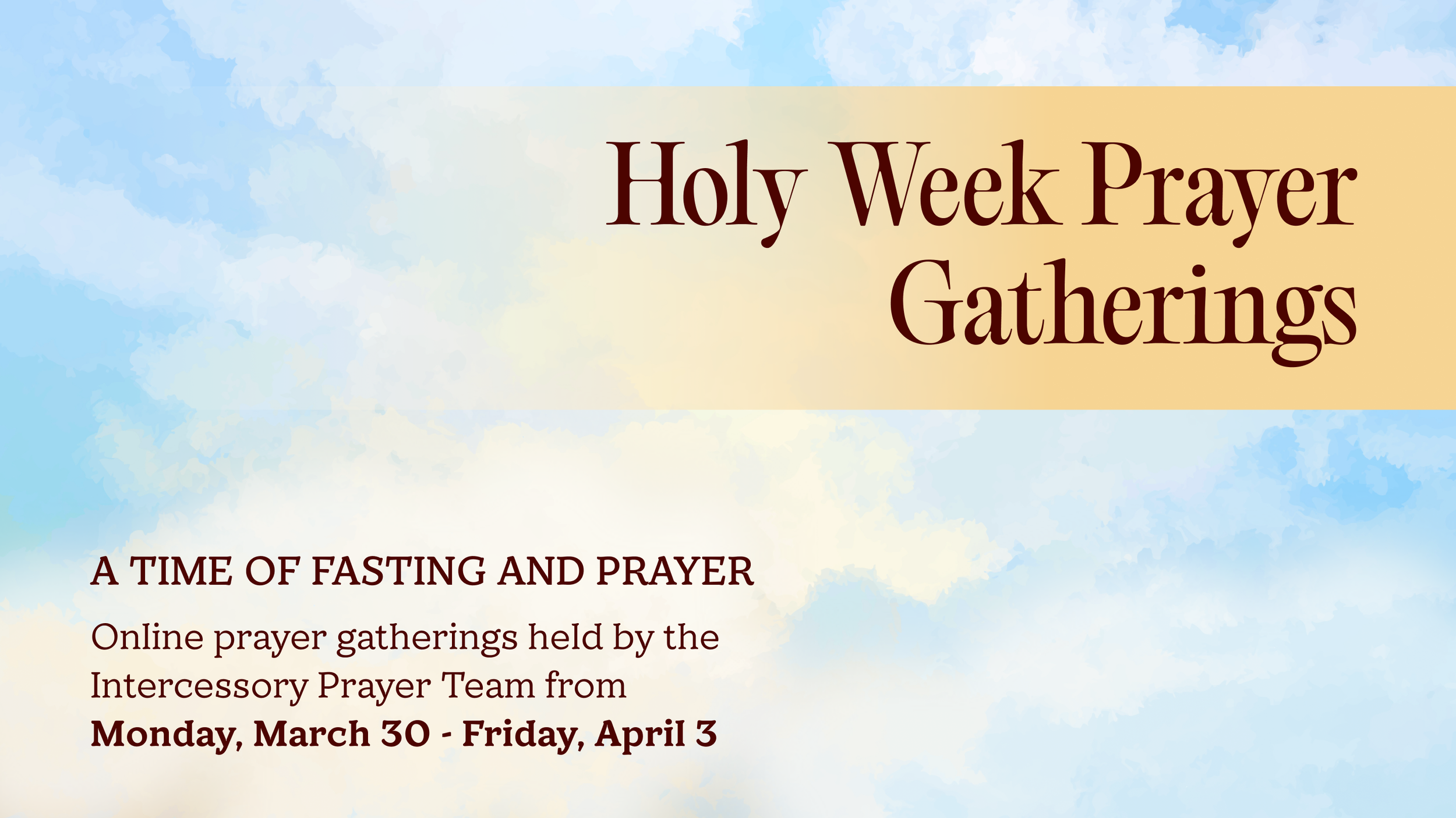From Monday, March 30 to Friday, April 3, the Intercessory Prayer Team will be leading online prayer gatherings. Please join us for a time of fasting and prayer.