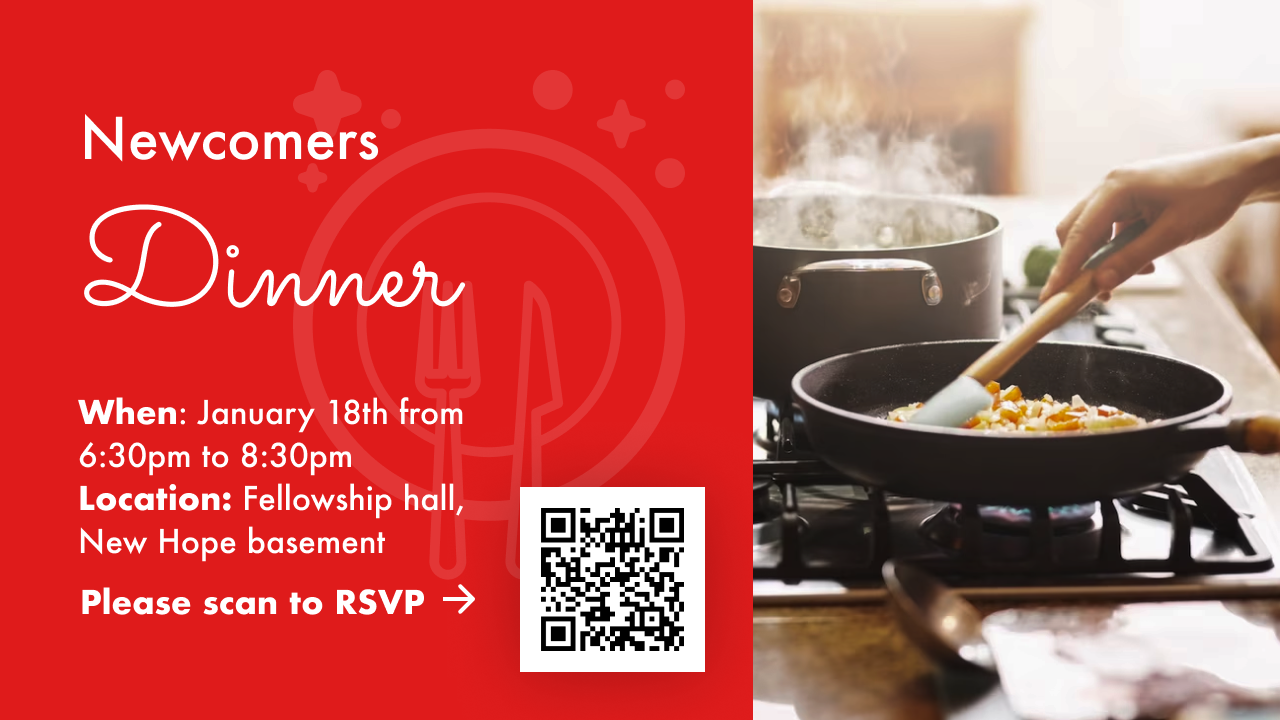 Are you new to the New Hope community, or looking to meet recent newcomers? Come join us at our Newcomers Dinner on Thursday, January 18th! Running from 6:30PM - 8:30PM, the dinner will take place in the fellowship hall downstairs. Please scan the QR-code or signup through the form (below) to RSVP.