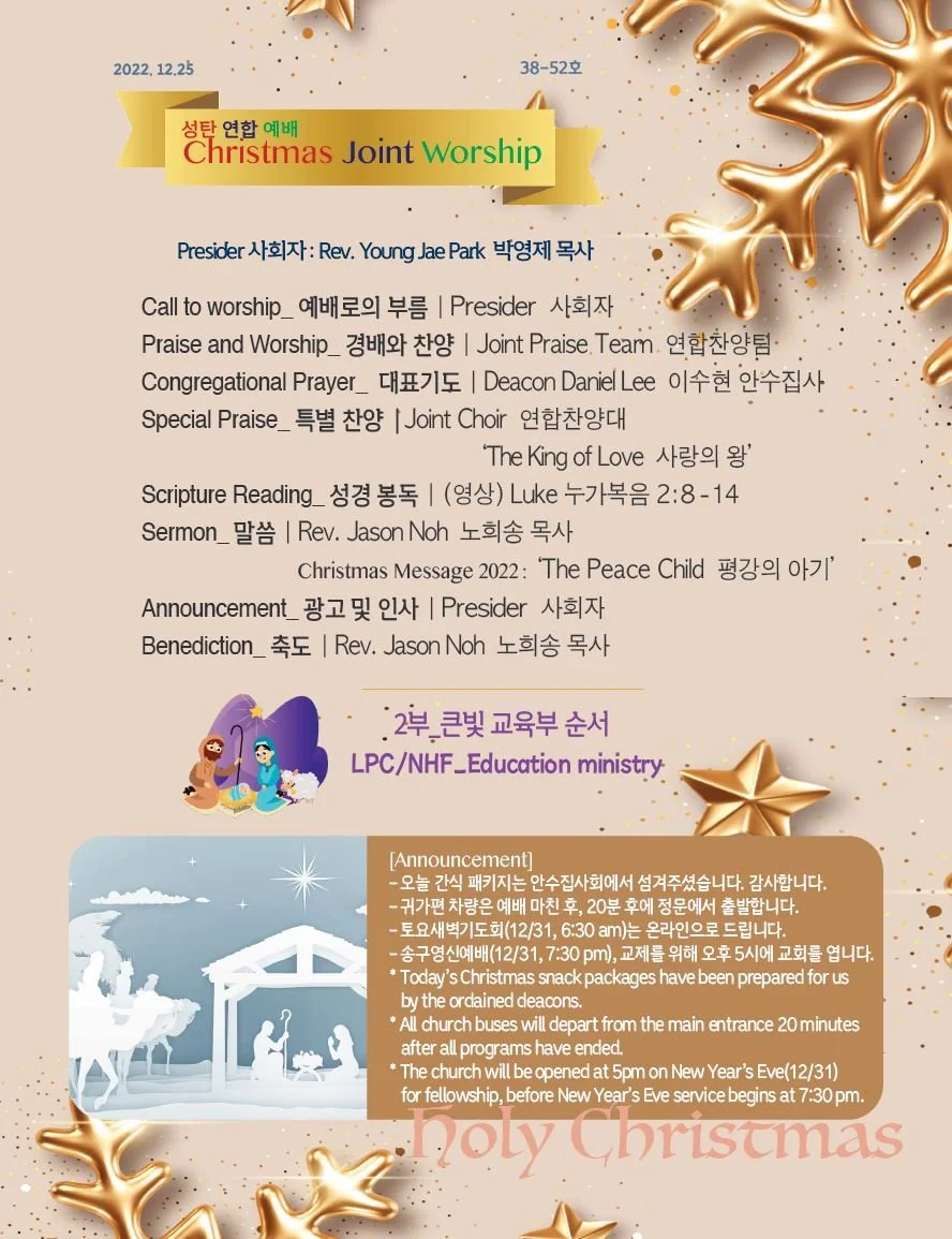 This year, we will celebrate Christmas morning with our church community with a special Christmas service. Part 1 will be a joint service with the Korean ministry (KM) and high school students. Part 2 will be a special Christmas presentation by the education department.
