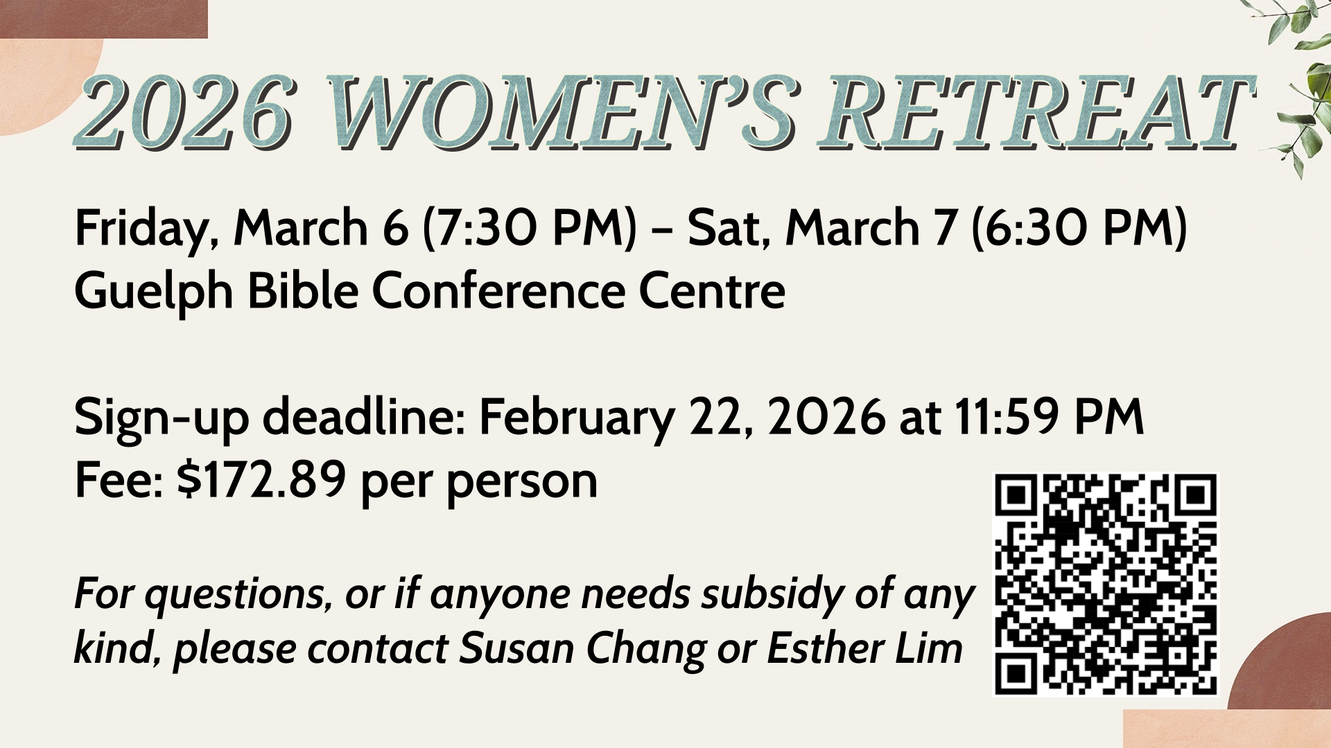 Women’s Retreat 2026 Friday, March 6, 2026 7:30 p.m. Saturday, March 7, 2026 6:30 p.m. Google Calendar ICS